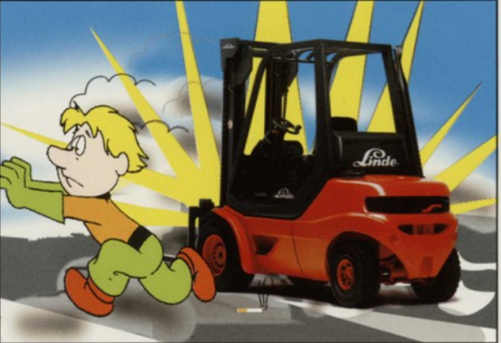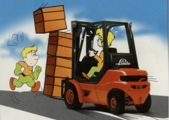 不允許任何人站在或經(jīng)過提升起的貨叉下,也不允許直接站在叉車后部或在叉車轉(zhuǎn)彎時位于后部回旋區(qū)內(nèi)。